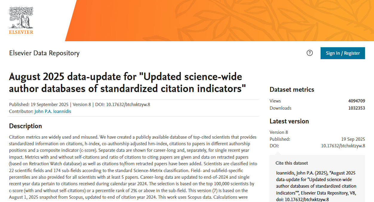 全球前2%顶尖科学家榜单是基于Scopus数据库的引用数据系统分析,使用总引用量(区分自引和他引,提供自引数据)、Hirsch H-index、共同作者修正的Schreiber Hm-index、单独作者、单独或者第一作者等6个关键因素评分,从“终身影响力”和“年度影响力”两个维度,从全球近700万名科学家中遴选出世界排名前2%的科学家,涵盖了22个领域和174个子领域,为科学家长期科研表现提供了一个衡量指标,能够更客观、更真实地反映科学家的影响力。其中生涯科学影响力榜单(Career)统计科学家职业生涯期间的综合表现,而年度科学影响力榜单(Singleyr)则更聚焦上一年度的学术影响力。该榜单在学术界目前慢慢被大学承认,认为是具有一定的影响力和公信力,被视为衡量科学家长期科研表现和学术影响力的一个客观指标。入选榜单,意味着该学者在其研究领域具有较高的世界影响力。
